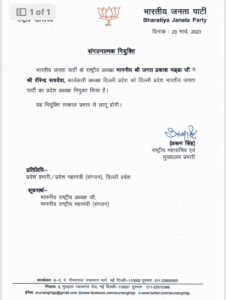 नई दिल्ली, 24 मार्च। भारतीय जनता पार्टी ने वीरेंद्र सचदेवा को दिल्ली प्रदेश बीजेपी का अध्यक्ष नियुक्त किया. वीरेंद्र सचदेवा एमसीडी चुनाव के बाद पूर्व अध्यक्ष आदर्श गुप्ता द्वारा इस्तीफा देने के बाद से बतौर कार्यकारी अध्यक्ष रूप में काम कर रहे थे. बता दें कि दिल्ली नगर निगम चुनाव में आम आदमी पार्टी के हाथों भारतीय जनता पार्टी की करारी हार के बाद तत्कालीन प्रदेश अध्यक्ष आदेश गुप्ता ने इसकी जिम्मेदारी लेते हुए अपने पद से इस्तीफा दे दिया था. उसके बाद वीरेंद्र सचदेवा को पार्टी हाईकमान ने दिल्ली बीजेपी का कार्यकारी अध्यक्ष नियुक्त किया था.