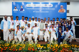 निशानेबाजी, रोइंग और महिला क्रिकेट टीमों के कुल 27 एथलीटों का खेल मंत्री श्री अनुराग सिंह ठाकुर द्वारा अभिनंदन किया गया। हरमनप्रीत कौर के नेतृत्व में महिला क्रिकेट टीम ने एशियन गेम्स में ऐतिहासिक स्वर्ण पदक जीता, जबकि रोइंग में कुल 5 पदक (2 रजत, 3 कांस्य) प्राप्त हुए। अब तक अधिकांश पदक निशानेबाजी से आए हैं जिसमें हमारी राइफल, शॉटगन और पिस्टल टीमों ने 13 पदक (4 स्वर्ण, 4 रजत और 5 कांस्य) जीते हैं।