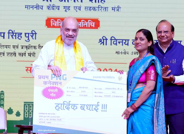 नई दिल्ली, 12मार्च। केन्द्रीय गृह एवं सहकारिता मंत्री अमित शाह ने दिल्ली के ग्रामीण इलाकों के विकास के लिए एक महत्वपूर्ण पहल करते हुए आज ‘दिल्ली ग्रामोदय अभियान’ के तहत 383 करोड़ रुपए की लागत से 41 गांवों में पाइप्ड नैचुरल गैस (PNG) सुविधा और 178 गांवों में विभिन्न विकास कार्यों का उद्घाटन किया। इस अवसर पर केन्द्रीय आवास और शहरी विकास एवं पेट्रोलियम और प्राकृतिक गैस मंत्री श्री हरदीप सिंह पुरी और दिल्ली के उपराज्यपाल श्री वी के सक्सेना सहित अनेक गणमान्य व्यक्ति मौजूद थे।