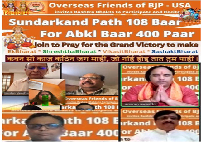 शिकागो/इलिनोइस, 20अप्रैल। सुंदरकांड परिवार, एक प्रमुख संगठन जो आध्यात्मिक और सांस्कृतिक परंपराओं के प्रति समर्पित है, ने शिकागो में “अबकी बार 400 पार” के लिए “सुंदर कांड पाठ 108 बार” के आयोजन के साथ एक महत्वपूर्ण संगठन की शुरुआत की है। सत्य और धर्म की विजय, समृद्ध और शांतिपूर्ण भारत की प्रगति और विकास के आशीर्वाद हेतु सुंदरकांड परिवार और प्रवासीभारतीय, ओवर सीज फ्रेंडस ऑफ़ बीजेपी के साथ मिलकर इस अभूतपूर्व सुंदरकांड के 108 बार पाठ का आयोजन करना है, जिसका मुख्य उद्देश्य अब की बार 4०० पार का संकल्प है।