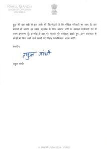 राहुल गांधी ने कहा कि घायलों को उचित उपचार और उचित मुआवजा दिया जाना चाहिए। उन्होंने कहा कि हाथरस में भगदड़ की घटना में 120 से अधिक लोगों की मौत की खबर से मैं स्तब्ध हूं। मैं हृदय में पीड़ा के साथ आपको यह पत्र लिख रहा हूं और मुझे पता है कि आप भी उस पीड़ा को महसूस कर रहे होंगे। राहुल गांधी ने कहा कि उन्होंने अलीगढ़ और हाथरस जिलों के कई पीड़ित परिवारों से मुलाकात की और उनका दर्द बांटने की कोशिश की।