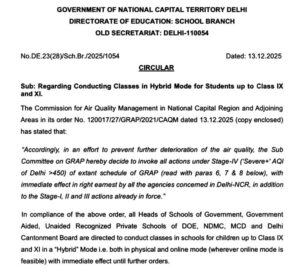शिक्षा व्यवस्था को लेकर भी अहम फैसला लिया गया है। दिल्ली में कक्षा 9 तक और कक्षा 11 तक स्कूलों को हाइब्रिड मोड में संचालित करने का निर्देश दिया गया है। इसका अर्थ है कि विद्यार्थी आंशिक रूप से ऑनलाइन और आंशिक रूप से विद्यालय आकर पढ़ाई करेंगे। एनसीआर के अन्य जिलों में भी जिला प्रशासन स्थानीय स्थिति के अनुसार आदेश जारी कर सकता है।