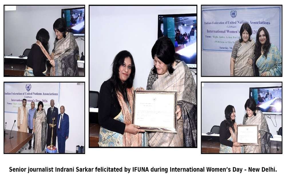 नई दिल्ली | 9 मार्च : अंतर्राष्ट्रीय महिला दिवस के उपलक्ष्य में राजधानी के कुतुब इंस्टीट्यूशनल एरिया स्थित कुतुब होटल परिसर में एक गरिमामय समारोह का आयोजन किया गया। इंडियन फेडरेशन ऑफ यूनाइटेड नेशंस एसोसिएशन्स (IFUNA) द्वारा आयोजित इस कार्यक्रम में पत्रकारिता और समाज सेवा के क्षेत्र में उत्कृष्ट योगदान देने वाली 10 महिला पत्रकारों को सम्मानित किया गया, जिनमें वरिष्ठ पत्रकार इंद्राणी सरकार का नाम प्रमुखता से शामिल रहा।